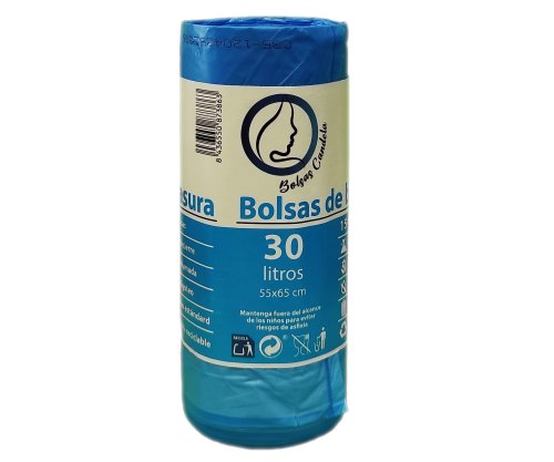 Rollo de bolsas de basura domésticas en azul con autocierre y 30 litros de capacidad para cubos pequeños. Medidas 55x60cms. 15 unidades por rollo. Galga 100.