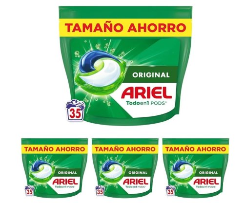 Este pack ahorro incluye 4 bolsas de 35 cápsulas cada una, sumando un total de 140 lavados. Ideal para quienes buscan comodidad, rendimiento y eficacia en cada colada, Ariel Pods elimina manchas difíciles mientras protege los tejidos y mantiene los colores vivos.