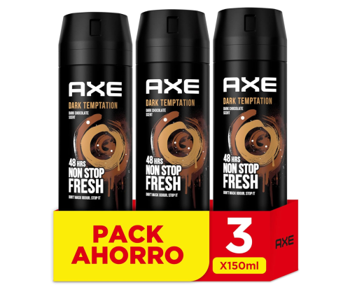 Déjate llevar por el irresistible aroma de Axe Dark Temptation. Este pack trae 3 sprays corporales para que siempre tengas uno a mano. Frescura duradera, notas dulces y un toque de misterio para tu día a día.