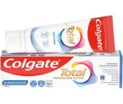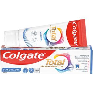 Colgate Total Blanqueador es mucho más que una pasta de dientes: es tu aliada diaria para una sonrisa blanca y saludable. Su fórmula avanzada combate las manchas superficiales y previene la formación de nuevas, ayudando a mantener el blanco natural de tus dientes. Además, protege contra caries, placa, sarro y problemas de encías, gracias a su acción antibacterial que dura hasta 12 horas. El frescor mentolado deja tu boca limpia y con aliento fresco, perfecto para quienes buscan resultados rápidos y efectivos. Apta para todo tipo de dientes y encías, incluso las más sensibles. Si buscas una rutina sencilla pero potente, esta pasta de dientes es para ti. Úsala a diario como parte de tu rutina de higiene bucal para notar dientes más blancos en poco tiempo.