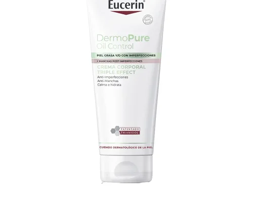 Eucerin DermoPure Crema Corporal 3 Efectos está pensada para quienes luchan contra granitos, marcas y rojeces en el cuerpo, no solo en la cara. Su fórmula combina ingredientes como ácido salicílico, Licochalcona A y decandiol, que ayudan a exfoliar suavemente, calmar la piel y prevenir nuevas imperfecciones. Es ideal para pieles grasas, mixtas o con tendencia acneica, y también para quienes sufren brotes por deporte, sudor o estrés. Su textura ligera no obstruye los poros y no deja sensación grasa, por lo que puedes vestirte enseguida. Además, ayuda a reducir las marcas post-acné y a mejorar la textura y el tono de la piel. Si buscas un producto práctico y multiusos para cuidar tu piel corporal, ¡este es tu aliado!