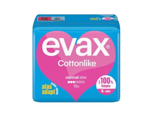 Las compresas Evax Cottonlike con alas en formato Normal son tu mejor aliada para los días de flujo medio. Su tacto extra suave tipo algodón cuida tu piel y evita irritaciones, mientras que su núcleo absorbente atrapa el flujo rápidamente para que te sientas seca y segura durante horas. Las alas ayudan a mantener la compresa en su sitio, sin desplazamientos incómodos, y su diseño fino y flexible se adapta a todos tus movimientos, ideal para tu día a día, la uni, el trabajo o salir con amigas. Olvídate de olores y molestias gracias a su sistema de control de olor. Apta para todo tipo de piel, incluso las más sensibles. Si buscas comodidad, protección y discreción, ¡estas compresas son para ti!