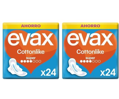 Las compresas Evax Cottonlike Super están diseñadas para chicas que buscan máxima protección y comodidad durante los días de flujo abundante. Gracias a su núcleo superabsorbente y superficie extra suave tipo algodón, te mantienen seca y fresca durante horas, evitando irritaciones y malos olores. Son ideales para usar tanto de día como de noche, y su formato de 48 unidades es perfecto para tener siempre a mano y olvidarte de imprevistos. Aptas para todo tipo de piel, incluso las más sensibles, ya que no contienen perfumes fuertes. Son discretas, flexibles y se adaptan a todos tus movimientos, para que sigas con tu vida sin interrupciones.