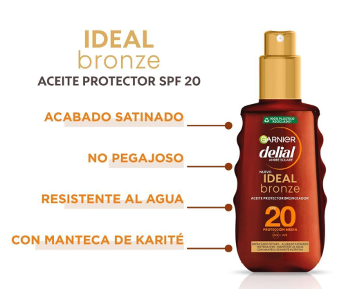 El Aceite Protector Bronceador Garnier Delial Ideal Bronze FPS 20 es el aliado perfecto para quienes buscan un bronceado bonito sin renunciar a la protección solar.