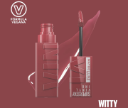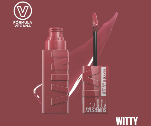 El labial líquido SuperStay Vinyl Ink de Maybelline en el tono 40 Witty te da un acabado súper brillante y duradero hasta 16 horas, sin transferencias y sin resecar.