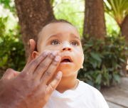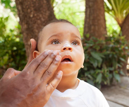 Aplica la leche solar generosamente sobre la piel seca de tu peque antes de salir al sol.