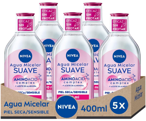 ¡Despídete de la sequedad! Este pack de 5 aguas micelares Nivea con Aminoacid Complex limpia, desmaquilla y cuida tu piel seca en un solo gesto.