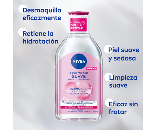 Es apta para piel seca y sensible, ya que no contiene alcohol y su fórmula es dermatológicamente testada. Los aminoácidos ayudan a fortalecer la piel y mantenerla elástica, mientras las micelas atrapan la suciedad como un imán.