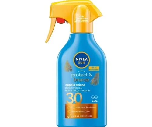 El Nivea Sun Protect & Bronze Spray Solar FPS30 es tu aliado para disfrutar del sol con total tranquilidad. Está pensado para quienes quieren protegerse de los rayos UVA/UVB sin renunciar a un bronceado natural, gracias a su fórmula con extracto de pro-melanina que estimula la producción de melanina propia de tu piel (¡sin autobronceadores!). Es resistente al agua y su textura ligera se absorbe rápido, sin dejar sensación grasa ni manchas blancas, por lo que es perfecto para usar en la playa, la piscina o cualquier escapada al aire libre. Apto para todo tipo de pieles, incluso sensibles, y dermatológicamente probado. Úsalo a diario durante el verano para conseguir un tono dorado y saludable mientras cuidas tu piel.